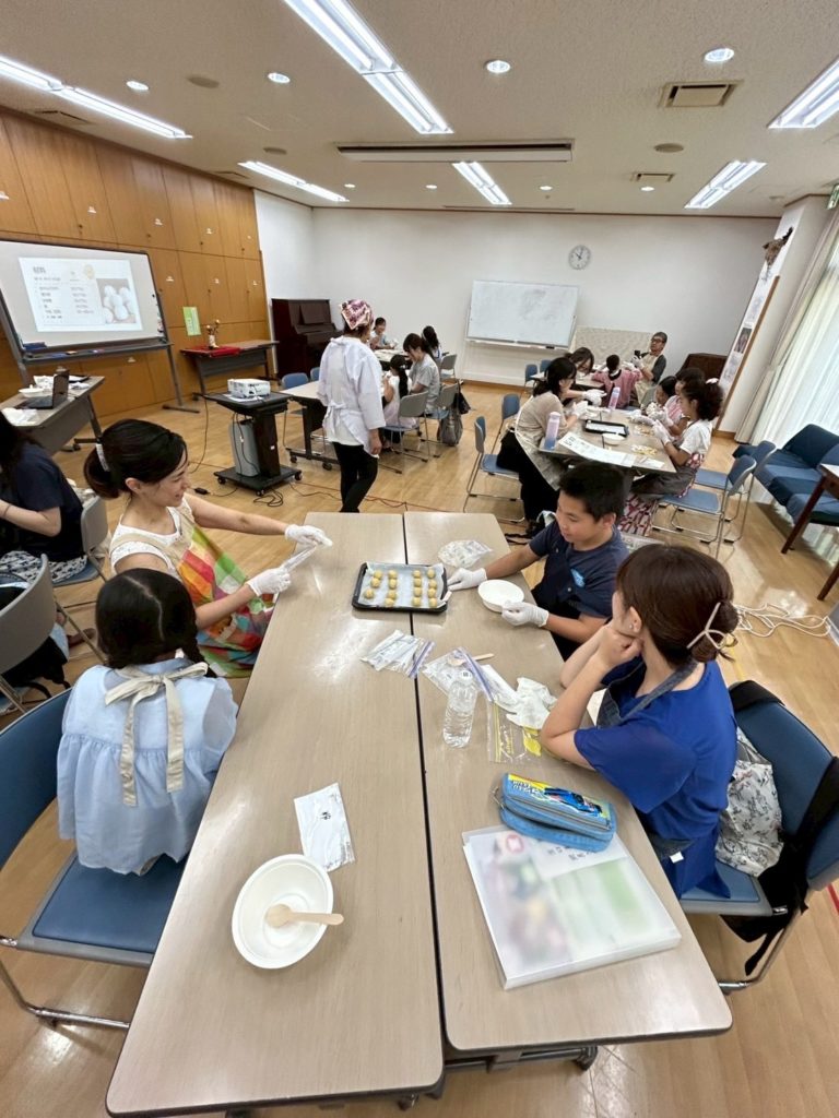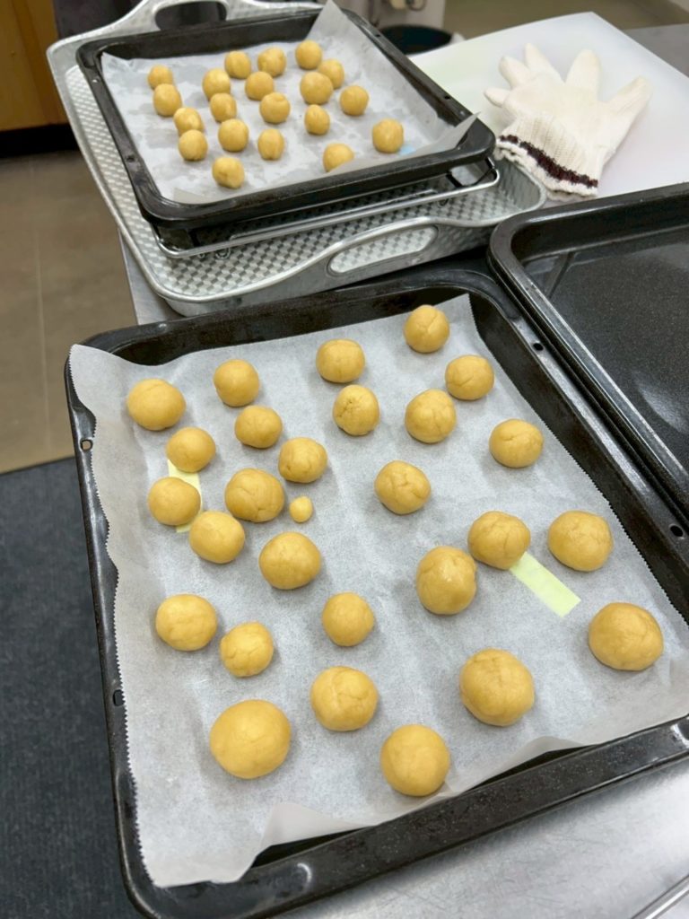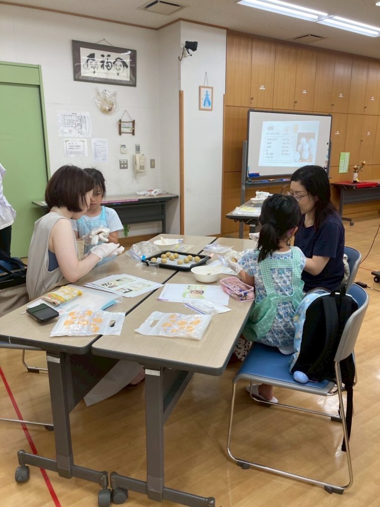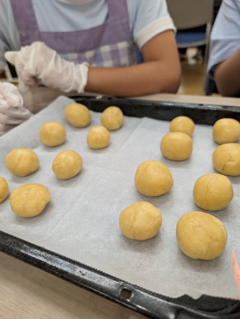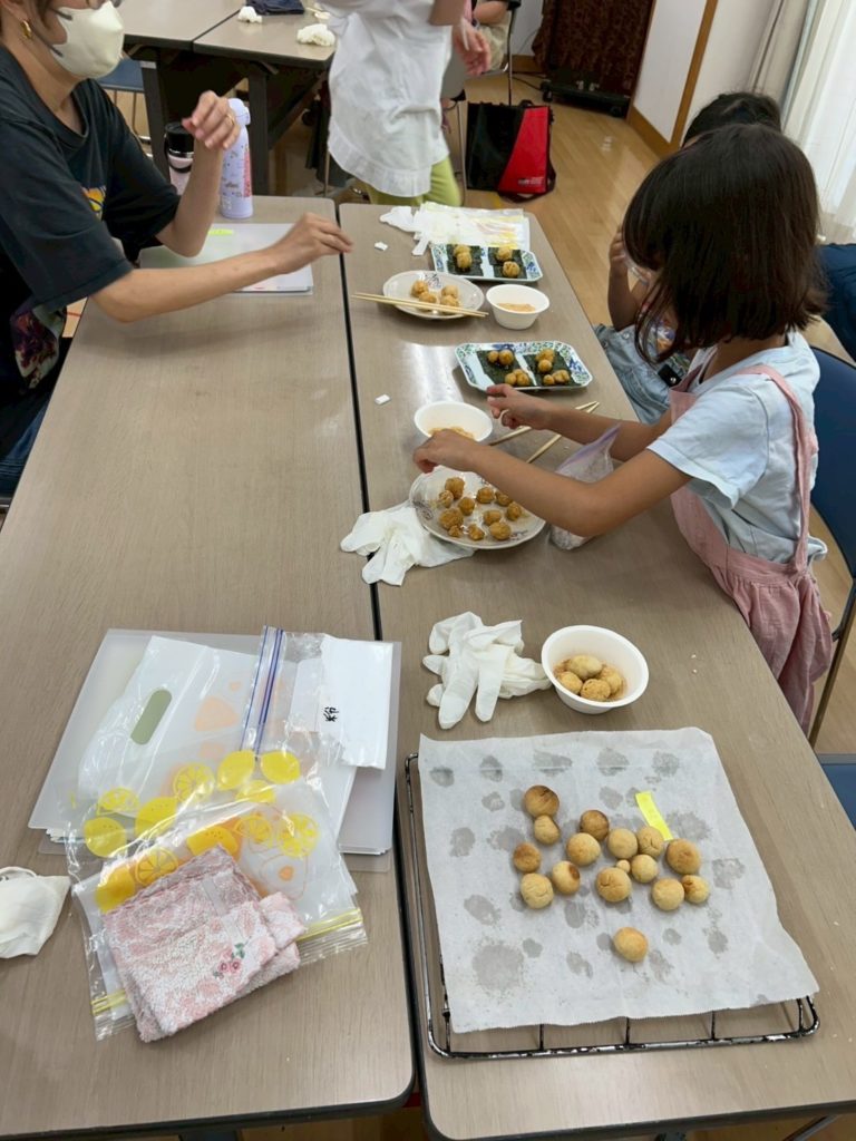 袋に材料を入れて丸めていくおからボーロは、それぞれ個性が出ていました。大きなものから小さなものまで、形も大きさもさまざま。焼き上がると、ほんのり甘い香りが会場いっぱいに広がりました。